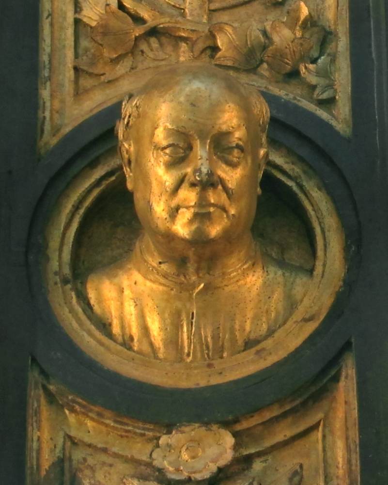 기베르티는 이 작품에 자신의 얼굴을 몰래 새겨 넣었는데, 이는 르네상스 시대의 예술가들이 자주 하던 유머였습니다.